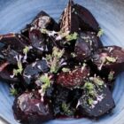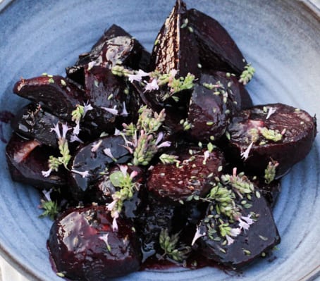 Langtidsstegt oksefilet, rosa og saftig, ledsaget af solbærglaserede rødbeder, sprødstegt pommes anna, rødvinssauce og frisk brøndkarse.