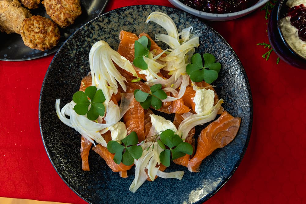 Appelsinmarineret laks med råsyltet fennikel og skovsyre