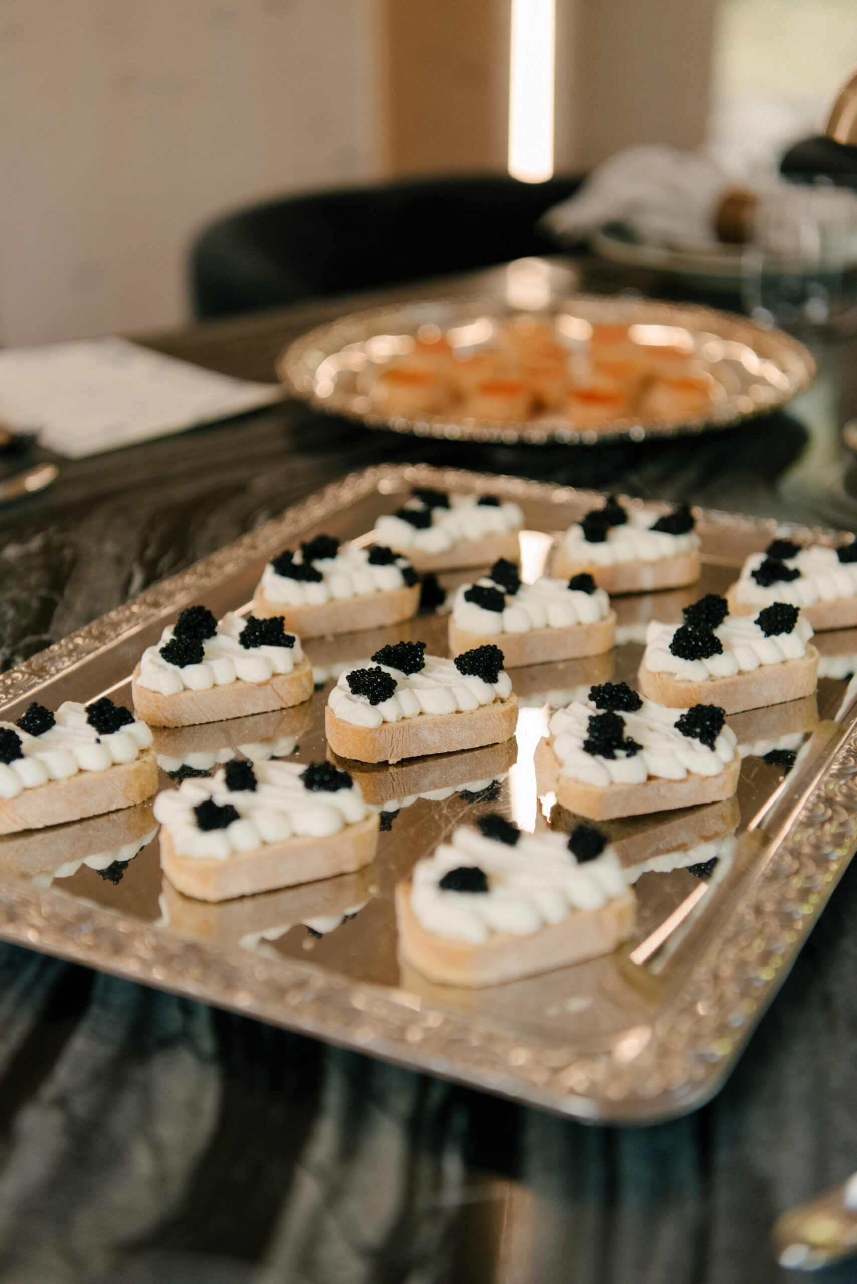 Endive-blad med vegetarisk hønsesalat og æble Madelines salvie og manchego Crostini med bagte beder og hasselnødder Mini tærte med karamelliseret løg og blåskimmel Crostini med ricotta og artiskok
