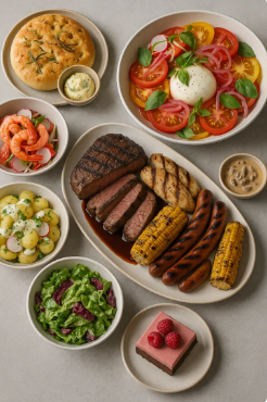 Perfekt til sommerens fester og hyggelige sammenkomster under åben himmel. Vores Sommer Grillbuffet er en smagfuld og varieret menu, der kombinerer saftige grillklassikere med friske, farverige salater og en lækker dessert som afslutning.